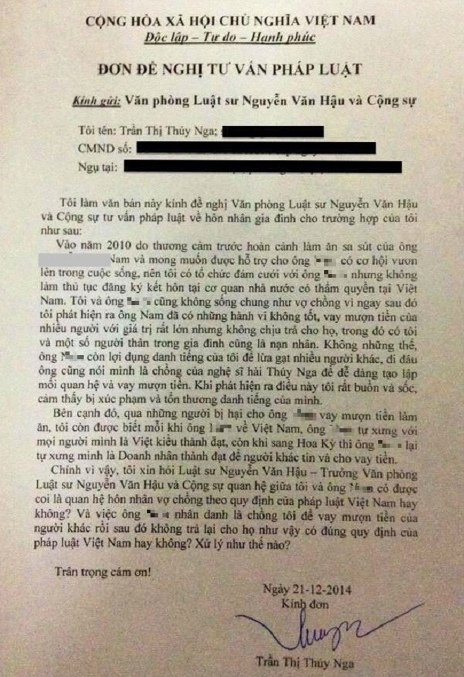 Tuy nhiên sau đó, anh N vẫn dùng danh nghĩa "chồng Thúy Nga" để đi vay mượn khắp nơi khiến uy tín, danh dự của nữ nghệ sĩ bị ảnh hưởng nghiêm trọng.