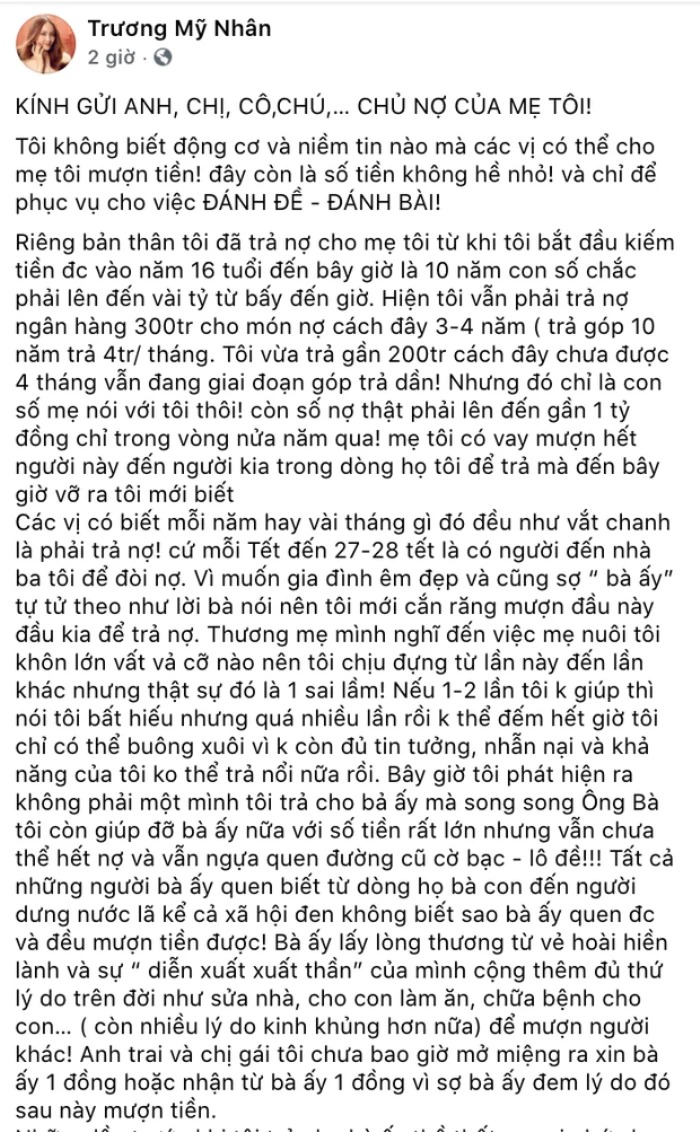 Tháng 7/2021, trên Facebook Trương Mỹ Nhân khiến người hâm mộ ngỡ ngàng khi có "tâm thư" dài tố chính mẹ ruột. Theo đó, nữ diễn viên tiết lộ mẹ ruột sa đà vào cờ bạc khiến cô phải làm việc cực khổ để trả nợ trong suốt 10 năm. Bên cạnh đó, Trương Mỹ Nhân cũng có những chia sẻ thẳng thắn về cuộc sống khó khăn nhưng vẫn cố gắng làm việc để trả nợ cho mẹ chỉ vì không muốn mang danh bất hiếu.