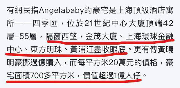 Trong năm 2018, Angela Baby cũng từng khoe cảnh view cực đỉnh từ phòng khách của mình. Có thông tin cho biết, căn biệt thư nữ diễn viên đang ở là do Huỳnh Hiểu Minh mua và nằm ngay giữa đoạn đường "hoàng kim" của thành phố Thượng Hải – nơi vốn nổi tiếng là tấc đất tấc vàng. Được biết, giá nhà ở đây lên tới ít nhất 200 nghìn tệ/m2, tức là có giá trị hơn 100 triệu tệ (328 tỷ). Hơn nữa, từ những hình ảnh Angela Baby từng đăng tải trên mạng xã hội, có thể thấy được căn biệt thự này được trang trí rất xa hoa, chẳng khác nào khách sạn 5 sao. Ngoài ra, netizen cũng tinh ý phát hiện những chiếc ốp điện thoại mỹ nhân này dùng đều được làm bằng da cá sấu đắt tiền.