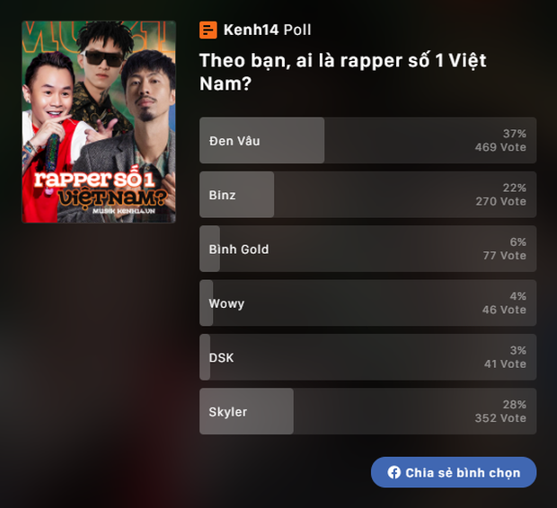 Ngay lập tức, 1 cuộc khảo sát trên mạng xã hội đã diễn ra, cuối cùng Đen Vâu là người có lượt bình chọn cao nhất. Tuy nhiên, kết quả này cũng không thể hiện được việc vụ bồ cũ "rapper số 1" Việt Nam lộ ảnh nóng có liên quan quan đến Đen Vâu, việc anh được bình chọn nhiều có thể là do được khán giả quá yêu mến.