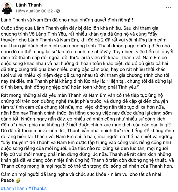 Trên Fanpage chính thức vào rạng sáng ngày 28/2, Lãnh Thanh đã đăng tải một tâm thư dài để nói về chuyện tình cảm giữa anh với Nam Em. Đầu tiên, nam người mẫu khẳng định chắc nịch và chốt hạ mối quan hệ như sau: "Lãnh Thanh và Nam Em đã cho nhau những quyết định riêng!". Anh cho biết mình từng có cảm tình với cô khi gặp gỡ tại Vô Lăng Tình Yêu nhưng trở thành một cặp đôi ngoài đời lại là câu chuyện hoàn toàn khác. Cuối cùng, anh cho biết cả hai hoàn toàn chỉ là bạn bè, đồng nghiệp chứ không phải tình yêu. Về phía Nam Em, người đẹp chưa hề có động thái gì sau phát ngôn của Lãnh Thanh.