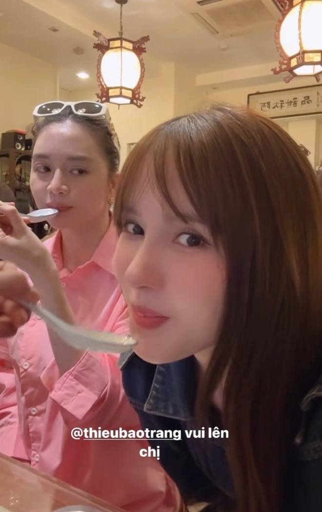 Còn phía Thiều Bảo Trâm, nữ ca sĩ cũng thoải mái thể hiện tình cảm. Cụ thể, khi cả nhóm cùng dùng bữa, Thiều Bảo Trâm và bạn trai "đu trend" đút ăn cho nhau. Giọng ca Sau Lưng Anh Có Ai Kìa còn tranh thủ mượn giây phút tình tứ này để "cà khịa" chị gái. Chứng kiến em gái được chiều chuộng, Thiều Bảo Trang gây cười khi để lộ biểu cảm "đơ" ra mặt. Trong khi đó, Thiều Bảo Trâm lại lầy lội cười tươi và trêu chọc chị gái: "Vui lên chị".