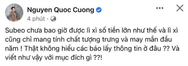 Tuy nhiên mới đây nhất, cả Hà Hồ và Cường Đô La đều đã lên tiếng trước thông tin này. Công khai ảnh chụp màn hình bài đăng liên quan đến quý tử, "đại gia phố núi" bức xúc phủ nhận chuyện Subeo nhận được lì xì "khủng" vào dịp Tết nguyên đán. Cụ thể, Cường Đô La viết: "Subeo chưa bao giờ được lì xì số tiền lớn như thế và lì xì cũng chỉ mang tính chất tượng trưng và may mắn đầu năm! Thật không hiểu các trang lấy thông tin ở đâu? Và viết như vậy với mục đích gì?".