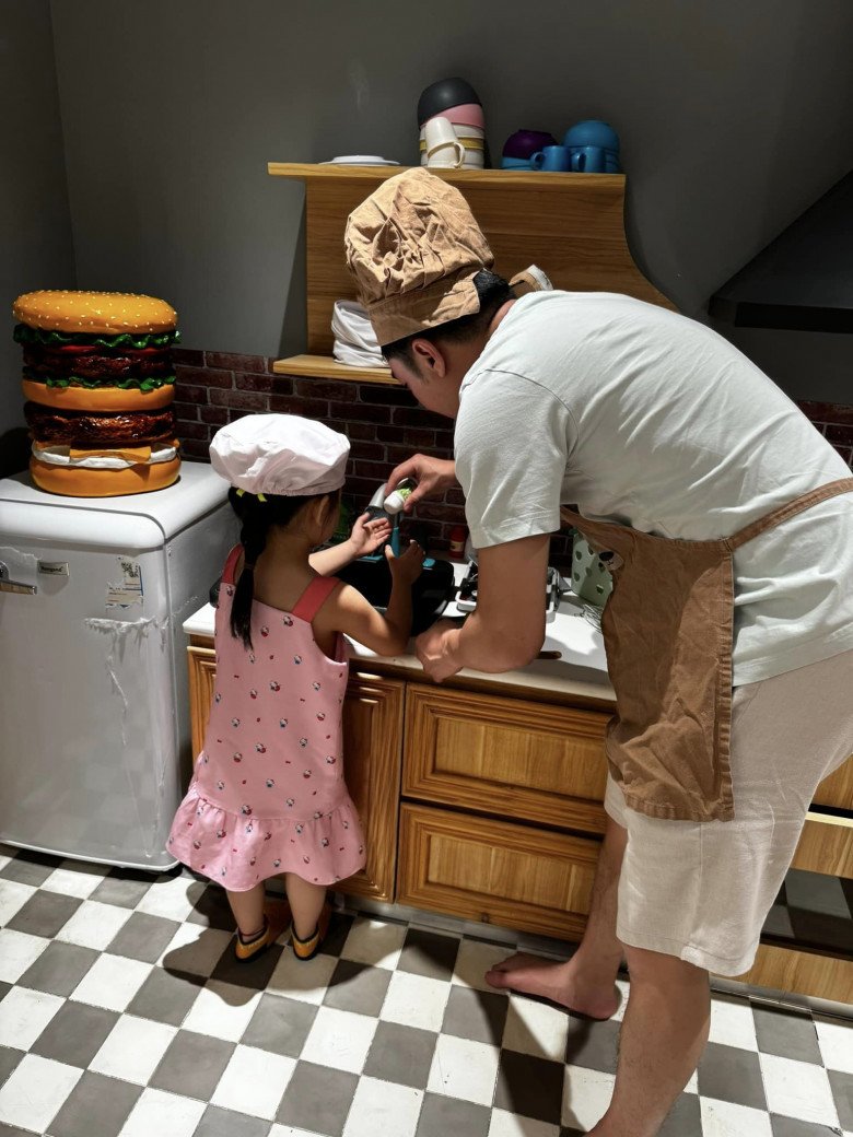 Mới đây trên trang cá nhân, Cường Đô La đăng tải hình ảnh cùng con gái Suchin sắm vai đầu bếp trong một khu bếp là mô hình trò chơi cỡ lớn. Nhìn trong ảnh, "đại gia phố núi" cùng ái nữ diện trang phục đầu bếp. Hai bố con tất bật trong phòng bếp, nghiêm túc chế biến thức ăn.