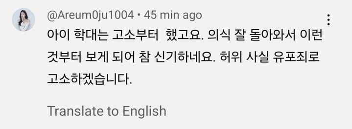 Vào chiều ngày 28/3, SPOTV News đưa tin Ahreum (cựu thành viên T-ara) đã tỉnh lại sau khi nhập viện vì tự tử vào rạng sáng ngày 27/3. Tài khoản YouTube của Ahreum đã để lại bình luận trên video cựu phóng viên Lee Jin Ho tố cáo cô vay tiền fan: "Tôi bắt đầu bằng vụ kiện lạm dụng trẻ em. Thật thú vị khi đây là điều đầu tiên tôi trông thấy từ khi tỉnh lại. Tôi sẽ kiện ông tội phát tán thông tin sai lệch". Điều này cho thấy cựu idol đã tỉnh lại và khỏe hơn, có thể sử dụng điện thoại để lên mạng xem video, bình luận đáp trả cựu phóng viên.