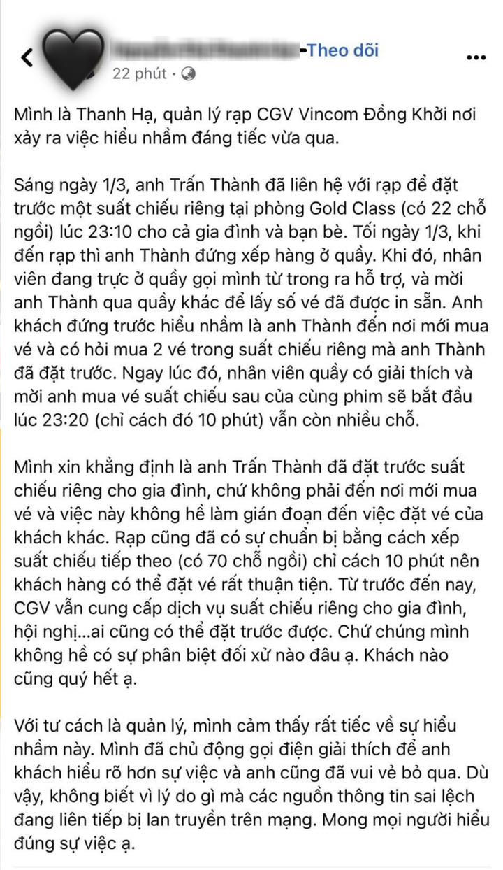 Liên quan đến sự việc Trấn Thành bị tố tranh mua vé của người khác tại rạp chiếu phim, sáng 3/3, chị T.H - đại diện rạp chiếu phim C. đã đưa ra lời giải thích chính thức trên trang cá nhân.