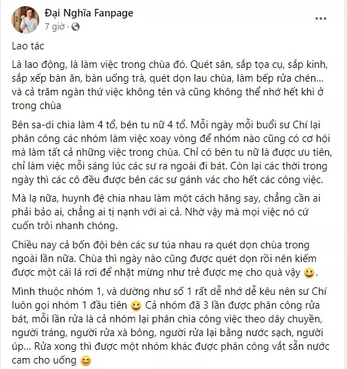 Chiều 10/11, Đại Nghĩa có bài viết chia sẻ tường tận về công việc ở chùa trong những ngày tu tập. Liệt kê chi tiết các việc phải làm, nam MC cho biết trong chùa cũng chia tổ, mỗi người sẽ được phân công những công việc cụ thể.