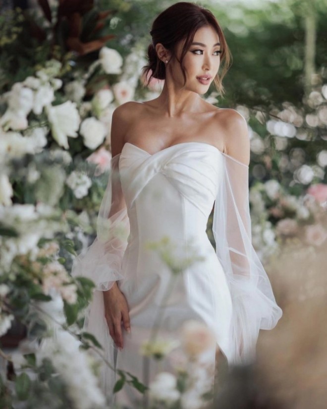 Trong đám cưới, Gypsy xinh đẹp và ấn tượng với bộ váy trắng muốt trễ vai. Cô khéo khoe vẻ ngoài sexy, gợi cảm không kém phần sang chảnh. Hơn thế, Gypsy luôn cười tươi rói khi đối diện với ống kính.