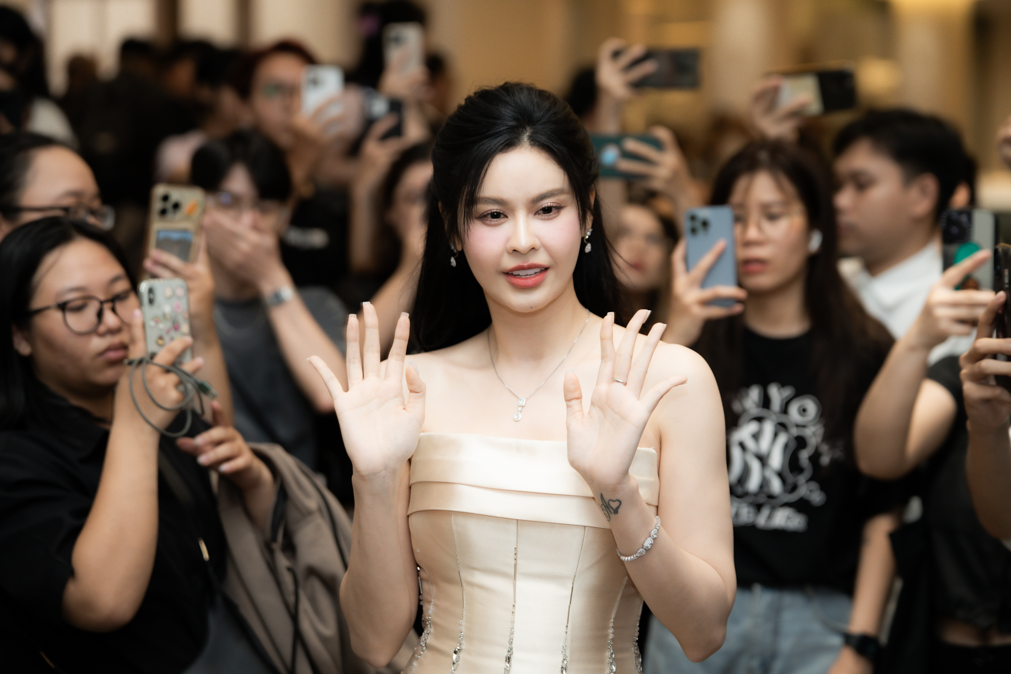 Trong ngày cưới, Anh Đức lên đồ chú rể bảnh bao, anh nở nụ cười tươi rói khi sánh bước bên vợ kém 12 tuổi. Anh Phạm chọn chiếc váy cưới lấp lánh, đính kết sang trọng từ một thương hiệu thời trang cưới nổi tiếng tại Hàn Quốc, được nhiều sao Việt lựa chọn. Cô dâu xinh xắn, đội vương miện như công chúa bước ra từ cổ tích. Các khách mời như Trấn Thành, Trường Giang - Nhã Phương, Sam, Huỳnh Phương, Khả Như, Thu Trang, Tiến Luật, Kiều Minh Tuấn, Ngô Kiến Huy... đều diện trang phục lịch sự, đúng với yêu cầu của cô dâu và chú rể.