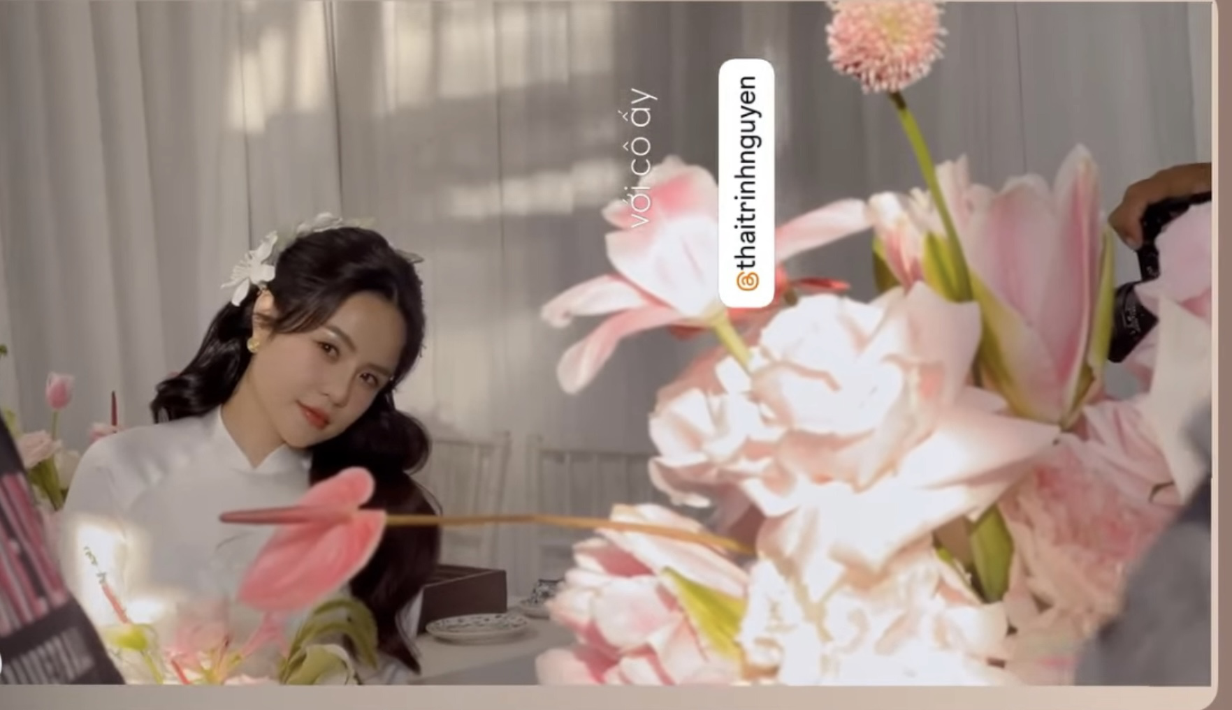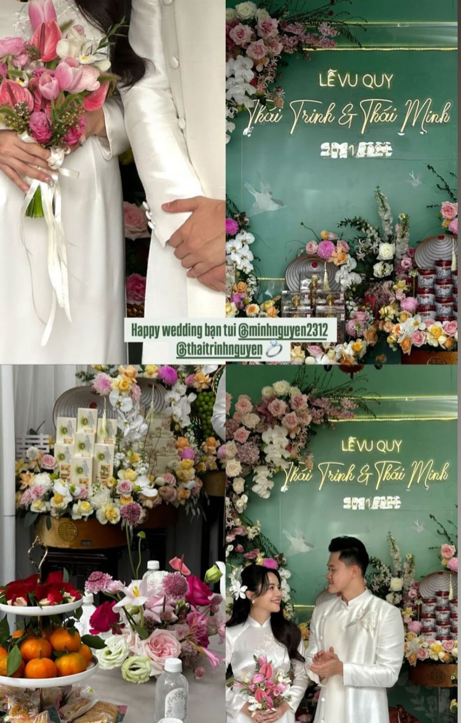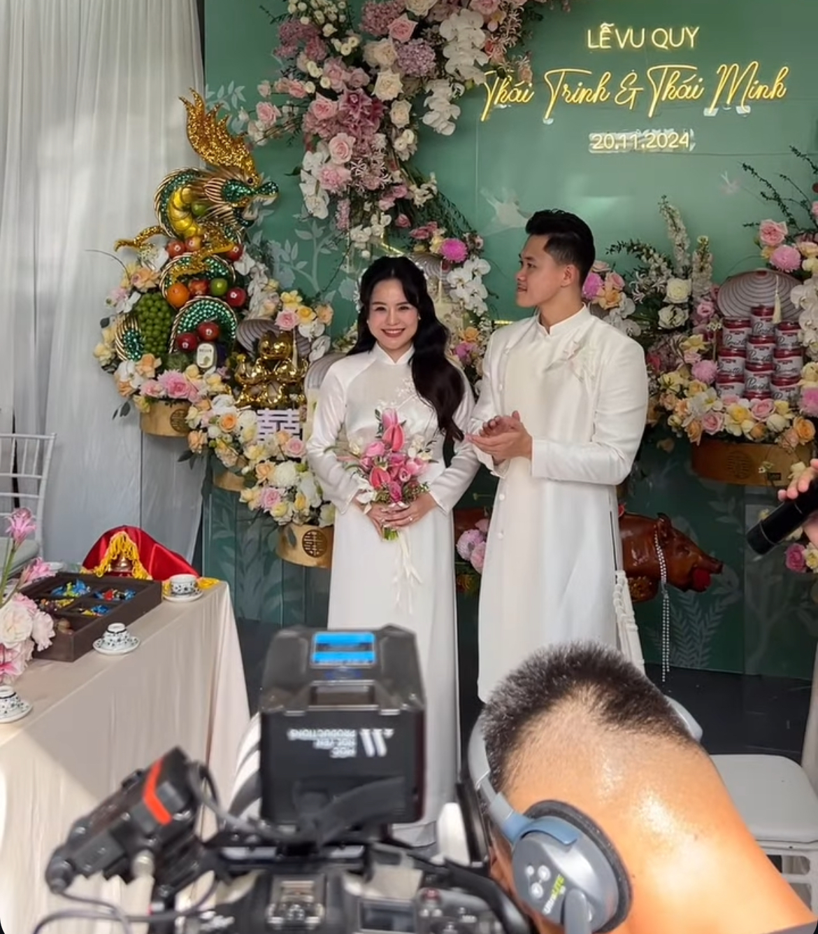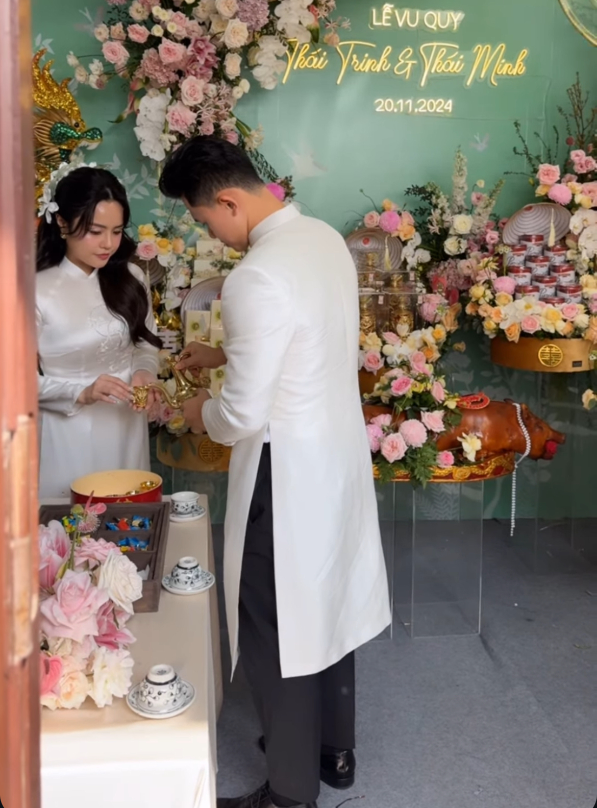 Trong ngày trọng đại, ca sĩ Thái Trinh diện chiếc áo dài trắng truyền thống, khuôn mặt luôn nở nụ cười hạnh phúc. Một số người bạn thân thiết của cô dâu đã có mặt để hỗ trợ bê tráp. Không gian nhà của Thái Trinh được trang trí ngập hoa tươi, nhìn đã biết dâu rể đầu tư chỉn chu cỡ nào cho hôn lễ. Vào đúng giờ lành, cặp đôi thực hiện thủ tục ra mắt gia đình 2 họ, dâng tráp cưới... chính thức đánh dấu cột mốc mới.