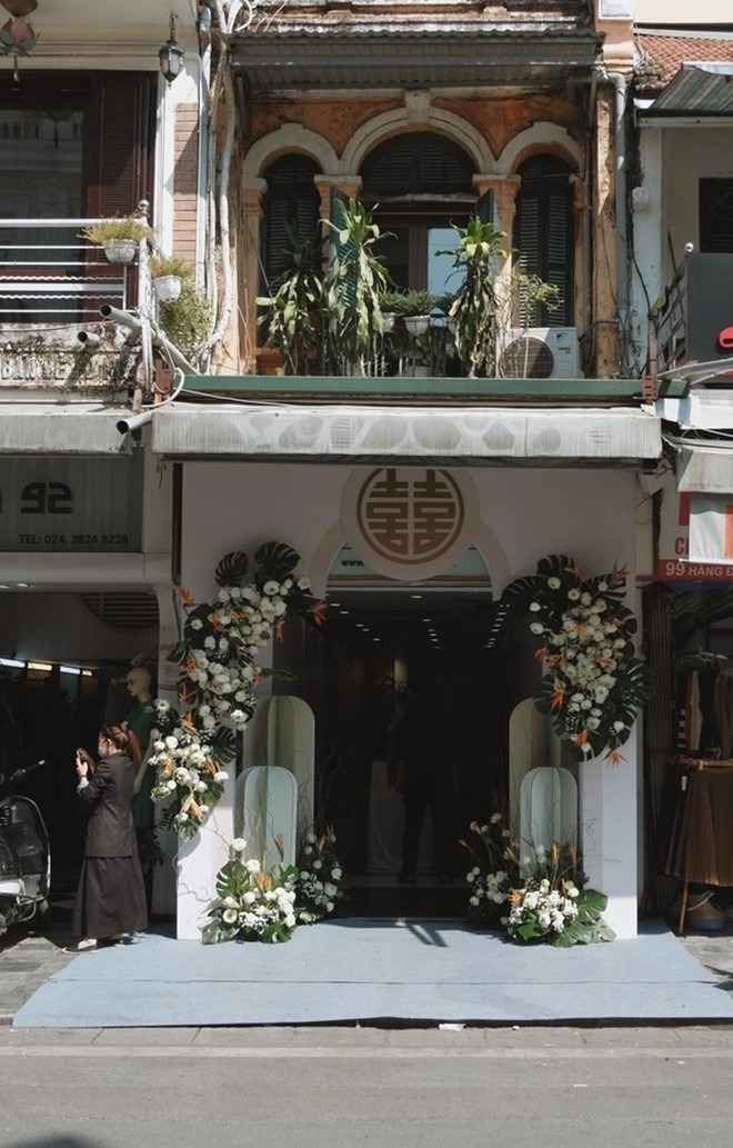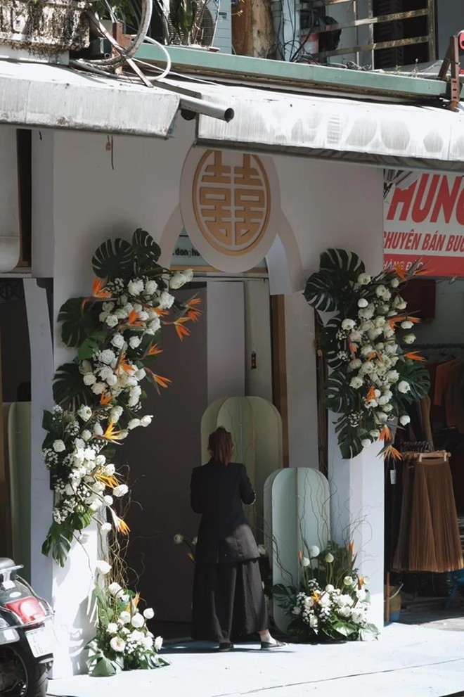 Chiều 17/10, đám hỏi của Hoa hậu Đỗ Mỹ Linh và con trai bầu Hiển - thiếu gia Đỗ Vinh Quang đã được tổ chức tại nhà riêng của cô dâu ở khu vực phố cổ Hà Nội. Từ đầu giờ trưa, công tác trang trí cổng cưới ở nhà Đỗ Mỹ Linh gần như đã hoàn thiện. Có thể thấy, đám hỏi được trang trí đầy hoa tươi với màu chủ đạo là trắng và xanh mint. Hoa sen được cô dâu chú rể ưu tiên lựa chọn khiến cho không gian trông đẹp mắt, dễ chịu.