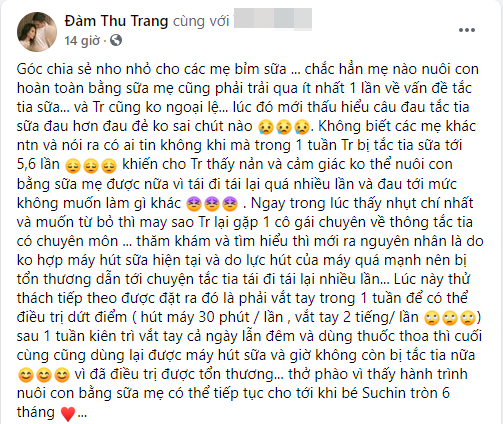 Được biết nguyên nhân khiến Đàm Thu Trang bị tắc tia sẻ là do cô không hợp với máy hút sữa hiện tại. Tuy nhiên bà xã Cường Đô La đã giải quyết được vấn đề này, hành trình nuôi con bằng sữa mẹ lại có thể tiếp tục cho tới khi tiểu công chúa trong 6 tháng.