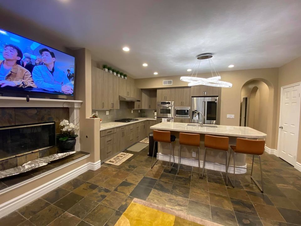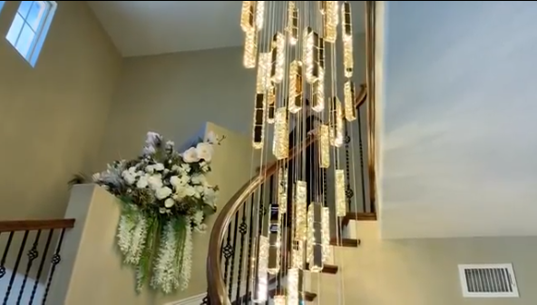 Lối lên cầu thang được thả đèn chùm dài ước chừng 5m được anh mang từ Việt Nam sang. Mr. Đàm là người cẩn thận nên anh đã mang theo một khối lượng lớn đồ đạc từ Việt Nam qua Mỹ, do anh đặt hàng riêng.