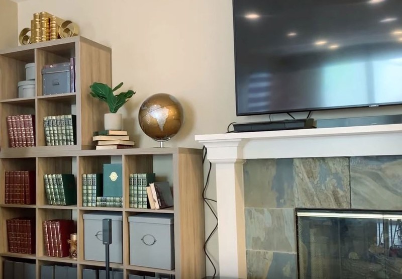 Dù bên ngoài khá cổ kính nhưng nội thất căn biệt thự lại hiện đại, tiện nghi. Một góc phòng khách được dùng trưng bày các loại sách và một số vật kỷ niệm, trang trí.