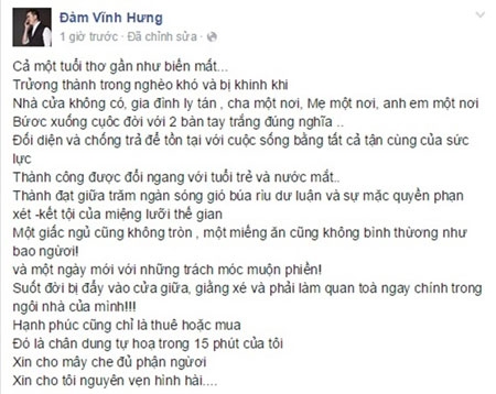 Đàm Vĩnh Hưng vừa có những tâm sự cay đắng về cuộc đời mình. Chia sẻ của Đàm Vĩnh Hưng nhận được sự quan tâm đặc biệt từ người hâm mộ.