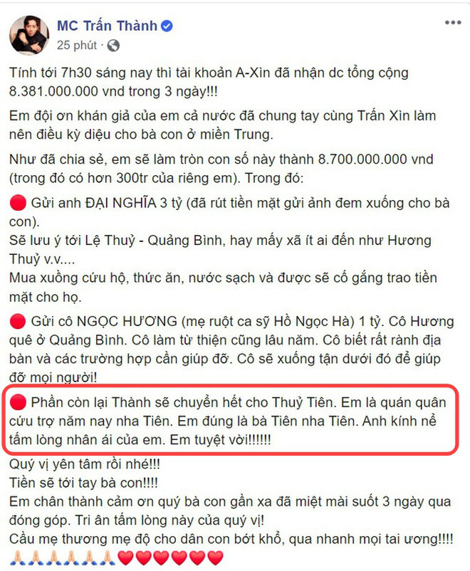 Tuy nhiên, Trấn Thành đã không làm đúng như thông báo trên, đến khi khán giả lên tiếng thắc mắc anh mới bắt đầu trần tình. Thay vì chuyển 4,7 tỷ đồng vào tài khoản cứu trợ miền Trung do Thuỷ Tiên làm đại diện, Trấn Thành đã chuyển hết cho mẹ Hà Hồ. Như vậy, cuối cùng, trong số tiền 9,45 tỷ đồng trong quỹ từ thiện, Trấn Thành đã gửi phía MC Đại Nghĩa 3 tỷ đồng, mẹ Hà Hồ 6,45 tỷ đồng và không hề có phần của Thuỷ Tiên như lời anh thông báo với cộng đồng mạng.
