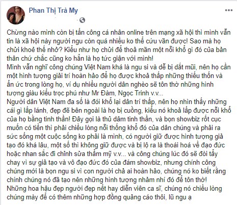 Bên cạnh đó, diễn viên này còn dùng lời lẽ nặng nề để nói về đàn anh, đang chị. Thậm chí, diễn viên này còn chỉ đích danh một số nghệ sĩ, gọi họ là “trọc phú” để minh họa cho quan điểm của mình: “Mình vẫn nghĩ công chúng Việt Nam khá...dễ bị dắt mũi, nên họ cần một hình tượng giải trí hoàn hảo để họ được khỏa lấp những thiếu thốn và ẩn ức trong lòng họ. Ví dụ nhiều người dân nghèo sẽ tôn thờ những hình tượng giàu kiểu trọc phú như Mr. Đàm, Ngọc Trinh…”.
