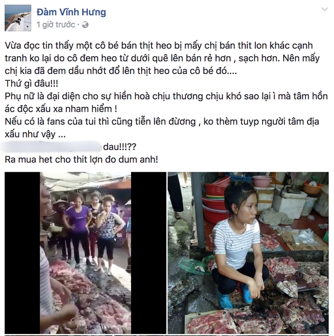 Nam ca sĩ tỏ gay gắt: "Vừa đọc tin thấy một cô bé bán thịt heo bị mấy chị bán thit lợn khác cạnh tranh không lại do cô đem heo từ dưới quê lên bán rẻ hơn, sạch hơn. Nên mấy chị kia đã đem dầu nhớt đổ lên thịt heo của cô bé đó. Phụ nữ là đại diện cho sự hiền hoà chịu thương chịu khó sao lại ì mà tâm hồn ác độc xấu xa nham hiểm! Nếu có là fan của tui thì cũng tiễn lên đường, không thèm tuýp người tâm địa xấu như vậy...".