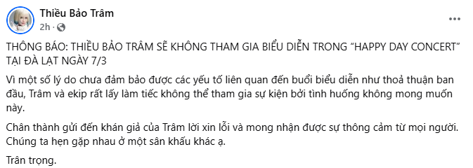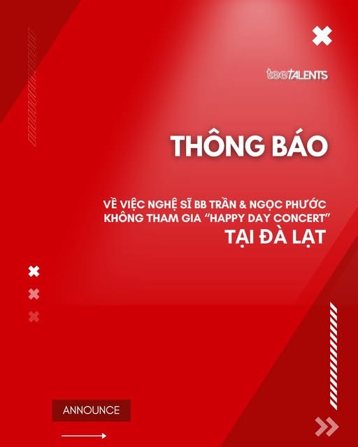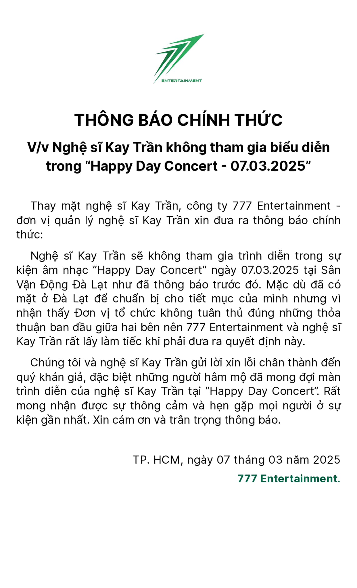 Tuy nhiên, sáng ngày hôm nay 7/3, khi chỉ còn vài tiếng nữa là đến giờ tổ chức Happy Day Concert 2025, hầu hết các nghệ sĩ cùng đồng loạt đăng tải thông báo sẽ không tham gia chương trình, với lý do giống nhau. Cụ thể, Trang Pháp “mở bát” lúc nửa đêm khi công ty quản lý The First Management đưa ra thông tin nữ ca sĩ sẽ không tham gia đêm nhạc vào ngày 7/3 như dự kiến. Lý do được đưa ra là BTC không thể đảm bảo quyền lợi của nghệ sĩ như đã thỏa thuận.