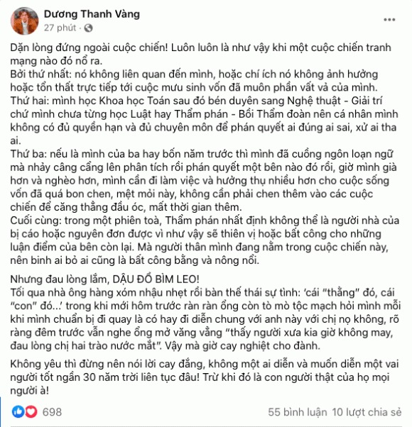 Không nói sâu về vụ lùm xùm, cũng không chỉ đích danh bất kỳ ai, nhưng những lời chia sẻ của Dương Thanh Vàng lại khiến người ta phải suy ngẫm.: "Đau lòng lắm, GIẬU ĐỔ BÌM LEO!