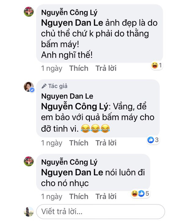Tuy nhiên, trái với sự tự hào của Đan Lê, NSND Công Lý đã "dội gáo nước lạnh" vô cùng hài hước: "Anh không nghĩ Khải Anh có thể chụp được ảnh đẹp như vậy! Hay vì cô đẹp thật!?"; "Ảnh đẹp là do chủ thể chứ không phải do thằng bấm máy. Anh nghĩ thế!". Đan Lê cũng hóm hỉnh phản hồi: "Vầng, để em bảo với quả bấm máy cho đỡ tinh vi". "Cô Đẩu" tiếp tục "bồi" thêm: "Nói luôn đi cho nó nhục".