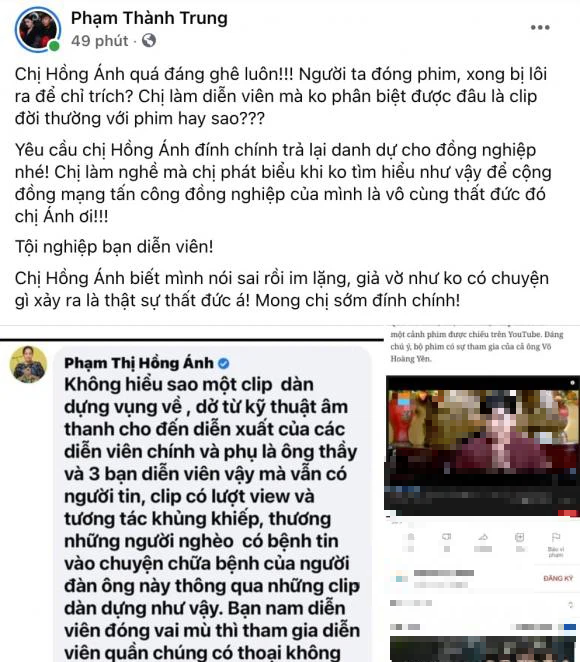 Phạm Thành Trung - một người có tiếng trong lĩnh vực truyền thông chia sẻ: "Chị Hồng Ánh quá đáng ghê luôn! Người ta đóng phim, xong bị lôi ra để chỉ trích? Chị làm diễn viên mà không phân biệt được đâu là clip đời thường với phim hay sao?