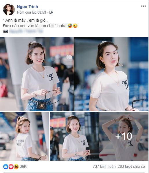 Cụ thể, người đẹp đã chia sẻ loạt ảnh với style năng động, trẻ trung và kín đáo khác hẳn phong cách sexy, hở bạo thường ngày cùng dòng chú thích: "Anh là mây, em là gió. Đứa nào xen vào là con ch..."