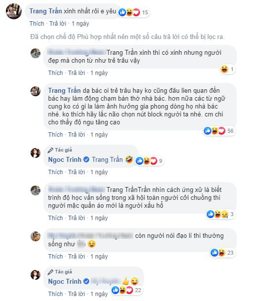 Điều đáng nói, khi thấy đàn em thân thiết nhận phản ứng tiêu cực như vậy, người mẫu Trang Trần đã không ngần ngại đáp trả gay gắt. Trả lời một bình luận chê bai Ngọc Trinh: "Xinh thì có xinh nhưng người đẹp mà chọn từ như trẻ trâu vậy", Trang Trần không tiếc lời phản pháo: "Dạ bác ơi, trẻ trâu hay không cũng đâu liên quan đến bác hay làm động chạm bàn thờ nhà bác. Hơn nữa các từ ngữ cũng không có gì là làm ảnh hưởng gia phong dòng họ nhà bác nhé. Không thích hãy lắc não, chọn nút block người ta nhé. Comment chi cho thấy độ ngu tăng cao" hay "Chưa biết trình độ học vấn của bạn lớp mấy, trường làng cô giáo băng hà nhưng cách bạn vào nhà người khác comment một status rất vui vẻ của người khác ở thái độ hằn học của kẻ nghèo hèn là mình biết bạn có đi học tốt nghiệp mà mua bằng".