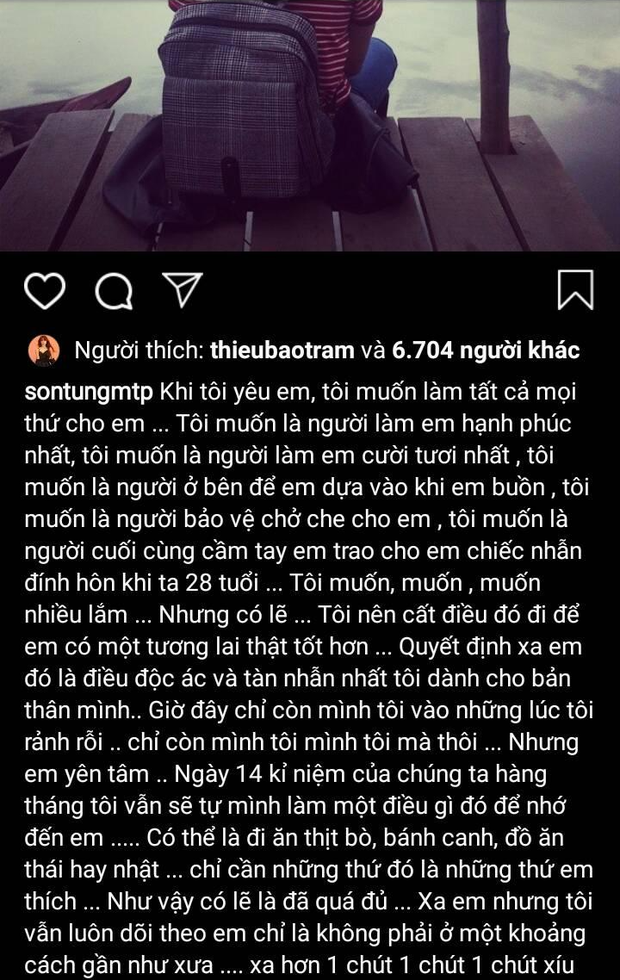 Ở diễn biến mới nhất, MXH tiếp tục xôn xao trước nghi vấn giọng ca gốc Thái Bình đã thẳng tay xóa dòng status tình cảm hiếm hoi được cho là nhắc đến Thiều Bảo Trâm vào năm 2014. Nguyên văn chia sẻ như sau: "Khi tôi yêu em, tôi muốn làm tất cả mọi thứ cho em... Tôi muốn là người làm em hạnh phúc nhất. Tôi muốn là người làm em cười tươi nhất. Tôi muốn là người ở bên em để em dựa vào khi em buồn. Tôi muốn là người bảo vệ che chở cho em. Tôi muốn là người cuối cùng cầm tay em, trao cho em chiếc nhẫn đính hôn khi ta 28 tuổi. Tôi muốn, muốn, muốn nhiều lắm. Nhưng có lẽ... tôi nên cất điều đó đi để em có một tương lai tốt hơn. Quyết định xa em là điều độc ác, tàn nhẫn nhất mà tôi dành cho bản thân mình. Nhưng em yên tâm... Ngày 14 kỉ niệm chúng ta hàng tháng, tôi sẽ tự mình làm một điều gì đó để nhớ đến em. Có thể đi ăn thịt bò, bánh canh, đồ ăn Thái hay Nhật... chỉ cần những thứ đó là thứ em thích. Như vậy có lẽ là quá đủ. Xa em nhưng tôi vẫn luôn theo dõi em chỉ là không phải ở một khoảng cách gần như xưa. Xa hơn 1 chút, 1 chút, 1 chút xíu thôi mà... Âm thầm bên em". Đặc biệt, Thiều Bảo Trâm cũng ấn nút "thả tim" bài đăng này của Sơn Tùng. Thời điểm đó, cả hai đã bắt đầu vướng nghi vấn hẹn hò.