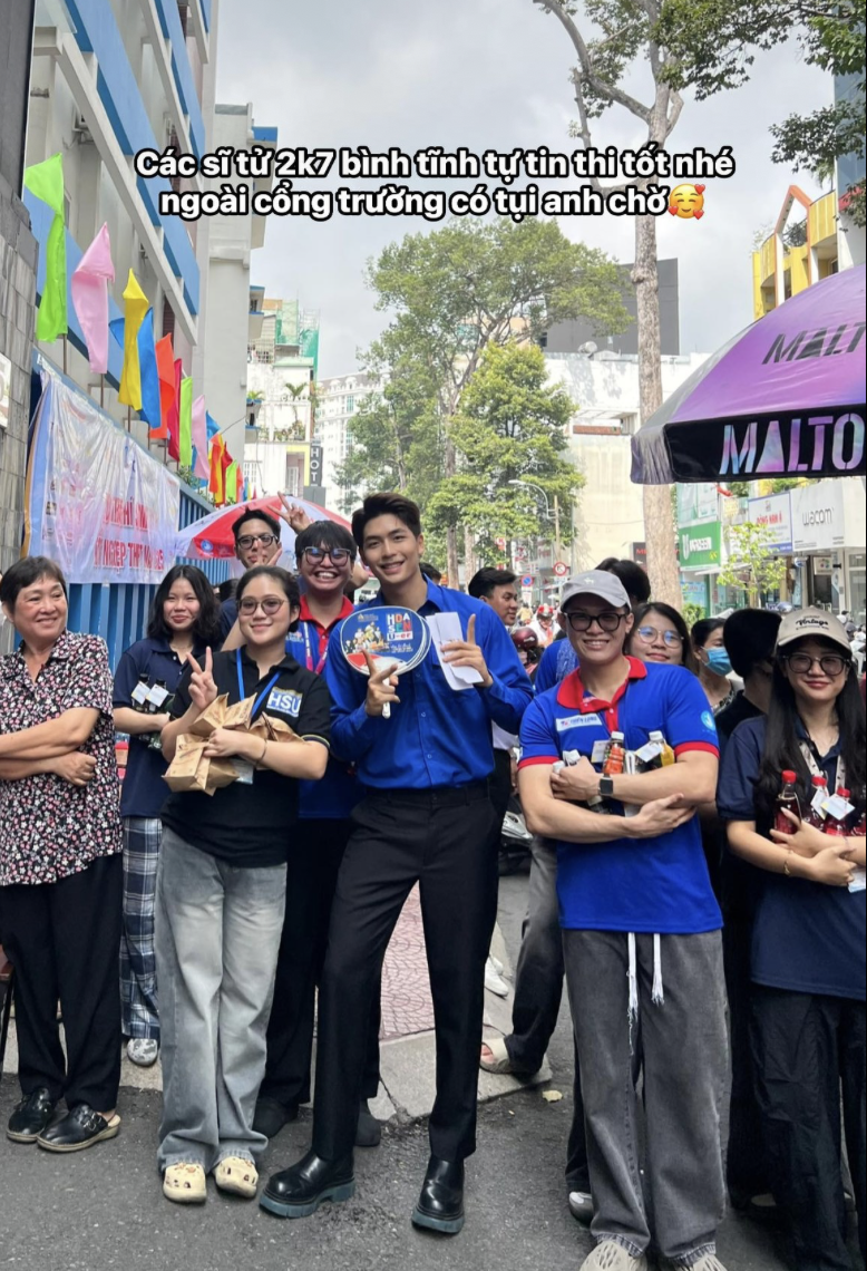 Không chỉ "gây mê" bằng visual chuẩn soái ca học đường, Quốc Anh còn ghi điểm khi nhiệt tình động viên, tiếp sức tinh thần cho các sĩ tử bằng những cái ôm ấm áp, nụ cười tươi rói và loạt cử chỉ gần gũi. Sự xuất hiện của anh chàng như một liều "vitamin tinh thần", tiếp thêm năng lượng tích cực cho các sĩ tử giữa mùa thi căng thẳng.