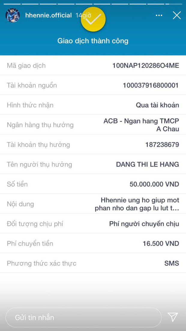 Suốt những ngày qua, Á hậu Lệ Hằng cũng đứng ra kêu gọi cứu trợ người dân vùng lũ. Ngay khi Lệ Hằng vừa lên tiếng, H'Hen Niê đã chuyển khoản nóng 50 triệu để chung tay cùng đàn chị. Được biết, đến thời điểm hiện tại Lệ Hằng đã quyên góp được 100 triệu đồng, và con số này vẫn đang tiếp tục tăng lên.