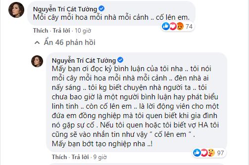 Động thái này của các nghệ sĩ đã nhận về nhiều phản ứng trái chiều của cư dân mạng. Trước tình hình này, MC Cát Tường đã phải lên tiếng đính chính: "Mấy bạn ơi đọc kỹ bình luận của tôi nha. Tôi nói mỗi cây mỗi hoa mỗi nhà mỗi cảnh, đèn nhà ai nấy sáng, tôi không biết chuyện nhà người ta, tôi chưa bao giờ là một người bình luận hay phát biểu linh tinh. Còn cố lên em là lời động viên cho một đứa em đồng nghiệp mà tôi quen biết khi gia đình nó gặp sự cố. Nếu tôi quen hoặc tôi biết vợ Hoàng Anh, tôi cũng sẽ vào nhắn tin như vậy. Mấy bạn bớt tạo nghiệp nha".