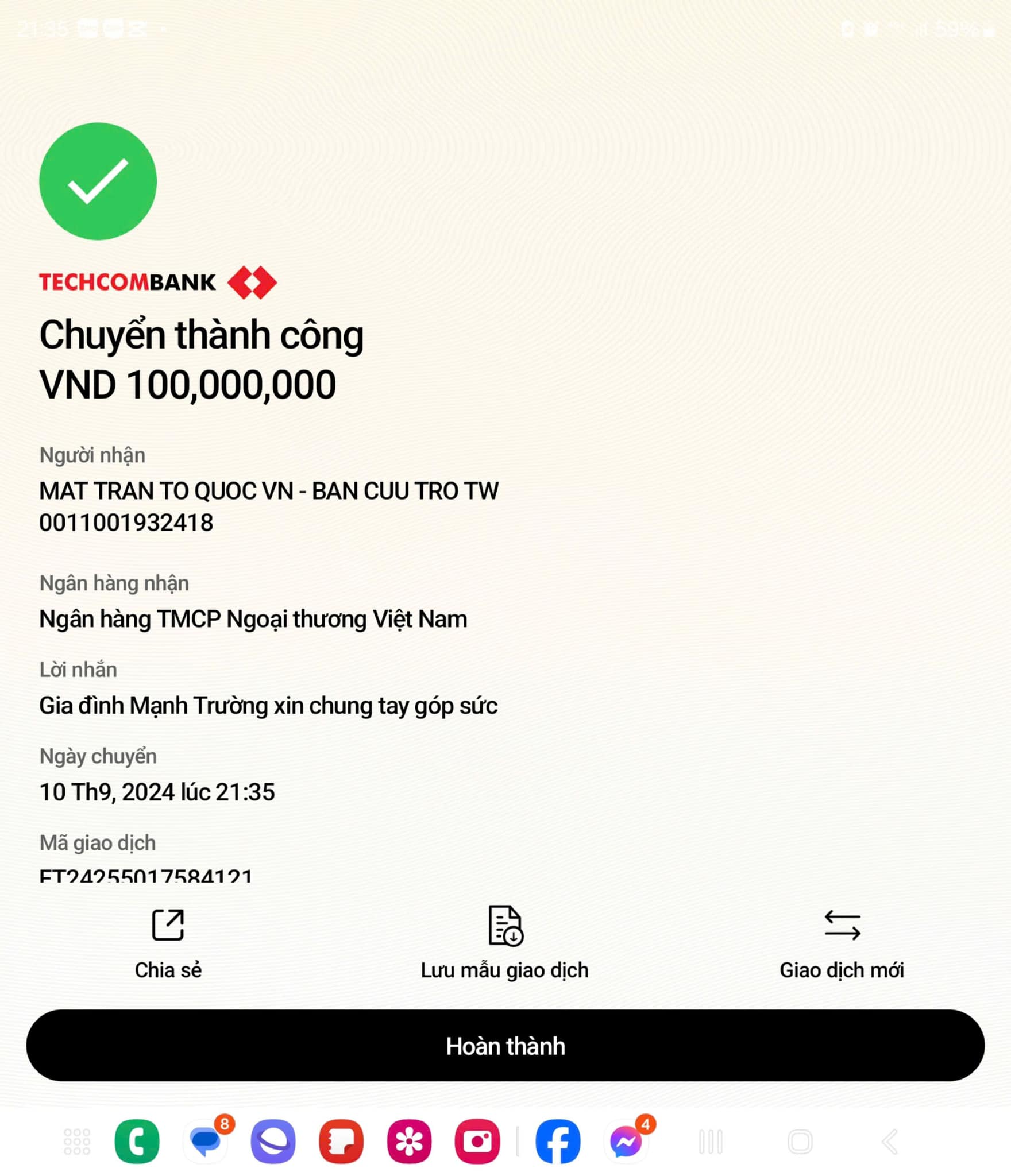 Tên Tài khoản: Mặt trận Tổ quốc Việt Nam - Ban Cứu trợ Trung ương