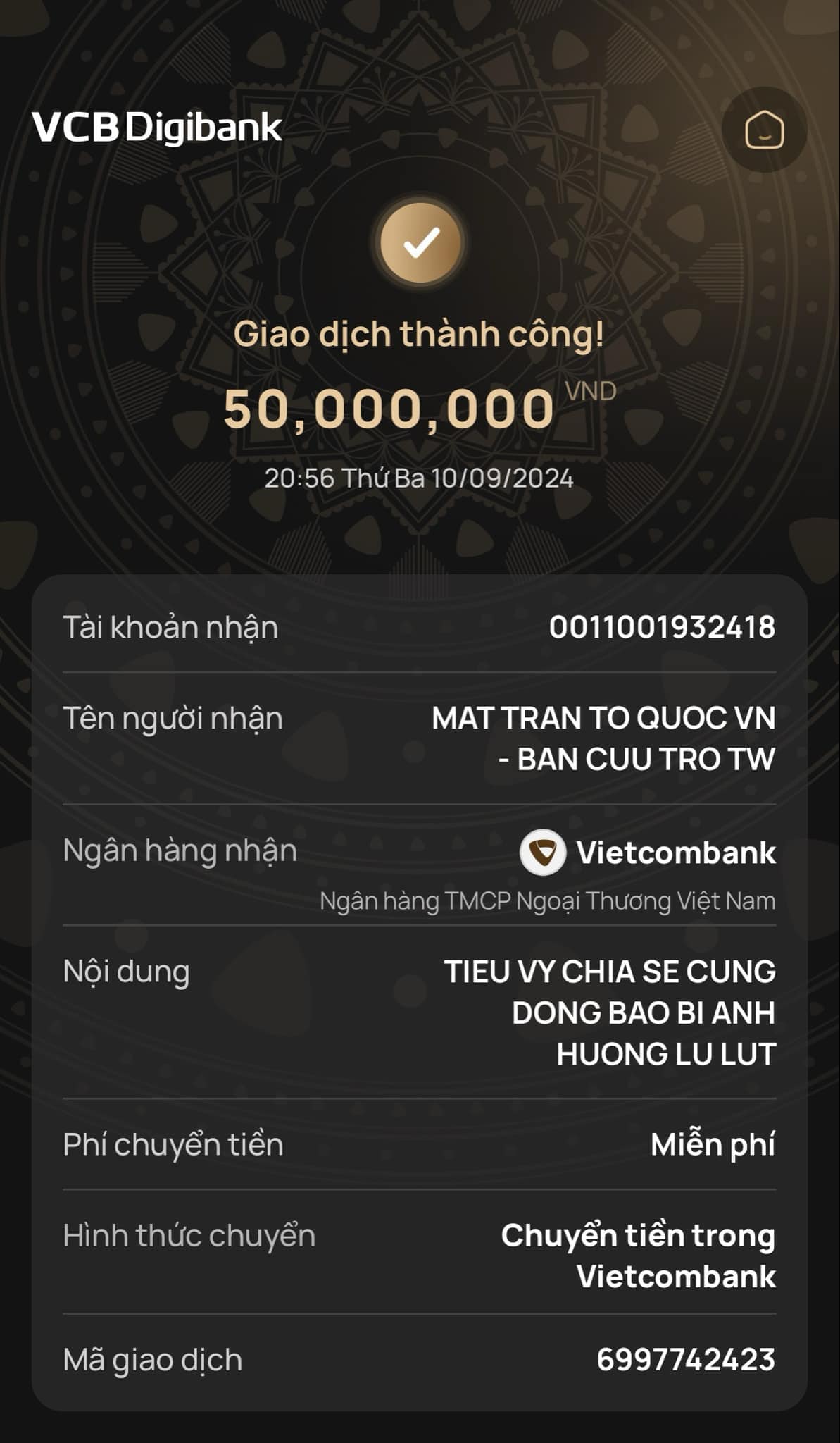Tính đến 12 giờ ngày 11/9, thêm nhiều nghệ sĩ như vợ chồng Phương Oanh - Shark Bình, Hòa Minzy, Hoa hậu Đặng Thu Thảo, Minh Hằng, Bảo Thy, diễn viên Mạnh Trường, Hoa hậu Tiểu Vy, Diễm My 9x, Lã Thanh Huyền, Hoa hậu Lương Thùy Linh, rapper Double2T... đã ủng hộ tiền ứng cứu bà con vùng bão lũ.