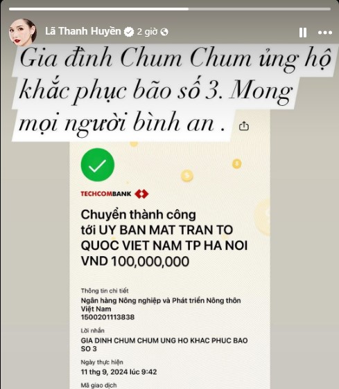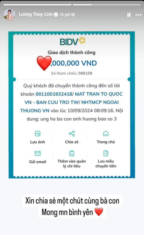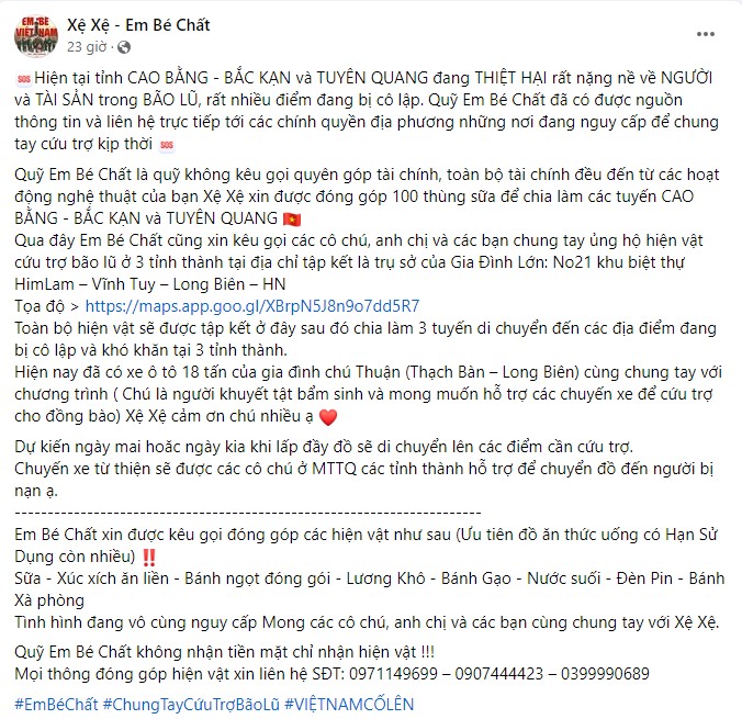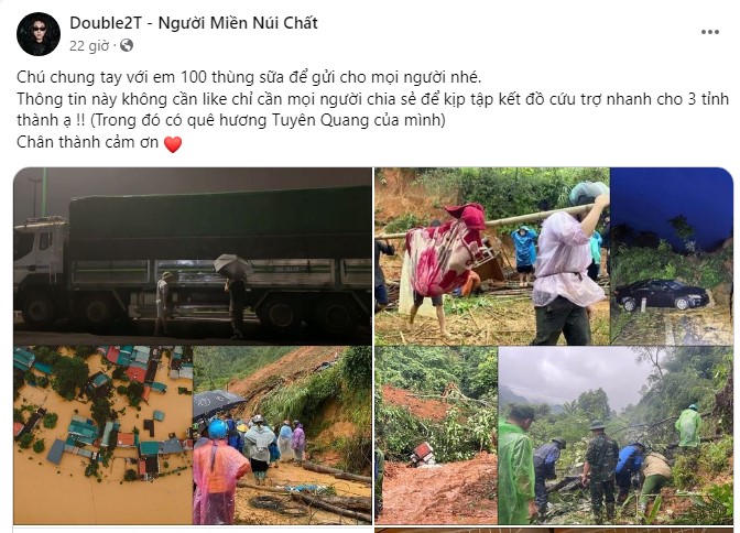 Với tinh thần tương thân tương ái, người dân cả nước đang cùng hướng về miền Bắc, chung tay quyên góp tiền, nhu yếu phẩm để hỗ trợ bà con trong thời điểm vô cùng khó khăn. Nhiều nghệ sĩ cũng đã ủng hộ trực tiếp tiền đến cơ quan chức năng, chia sẻ bài đăng và kêu gọi đóng góp để giúp đỡ đồng bào trước trận bão lũ lịch sử.