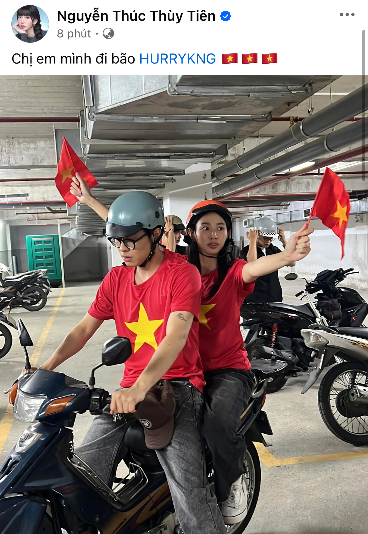 Trên mạng xã hội, Hoa hậu Thùy Tiên đăng loạt ảnh có 1001 biểu cảm meme "bất ổn" khi được Anh trai HURRYKNG đèo đi "bão" bằng xe máy. Thuỳ Tiên bỏ quên hình ảnh Hoa hậu, không chỉ hú hét mà còn mang cả nồi ra để nhập cuộc vui. HURRYKNG cũng vui vẻ ra mặt, hoá thân thành "boy phố" để đưa đàn chị hoà vào dòng người. Ngoài ra một đôi đi "bão" khiến netizen cười ngất chính là Kay Trần và Bùi Công Nam, cả hai diện luôn đồ đi diễn để ra phố.