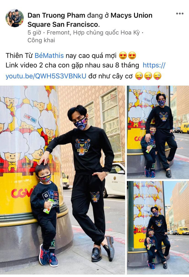 Cụ thể, trên trang cá nhân, anh đã đăng tải loạt khoảnh khắc hội ngộ của 2 bố con kèm dòng trạng thái: "Thiên Từ, Bé Mathis nay cao quá". Được biết, bà xã của anh đã chở con ra phi trường nhưng cậu bé không hề biết đang đi đón bố. Cho đến lúc Đan Trường xuất hiện, cậu bé đã không giấu được niềm vui sướng và liên tục hôn bố thắm thiết. Đáng chú ý, vóc dáng của quý tử nhà Đan Trường khiến công chúng không khỏi bất ngờ. Cậu bé nhỏ xinh năm nào nay đã cứng cáp, đứng đến hơn nửa người bố rồi.