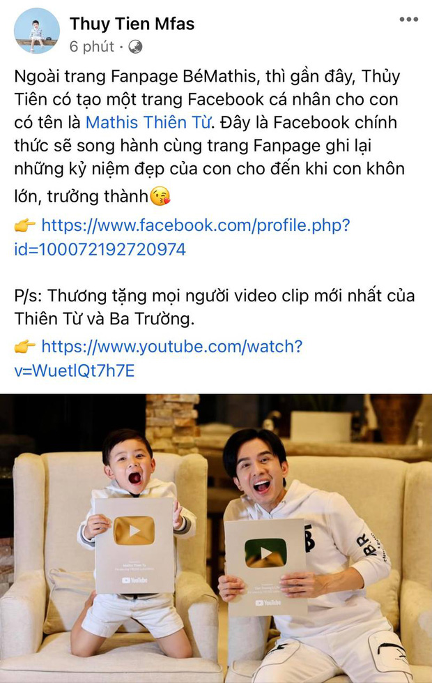 "Ngoài trang Fanpage Bé Mathis, thì gần đây, Thủy Tiên có tạo một trang Facebook cá nhân cho con có tên là Mathis Thiên Từ. Đây là Facebook chính thức sẽ song hành cùng trang Fanpage ghi lại những kỷ niệm đẹp của con cho đến khi con khôn lớn, trưởng thành. P/s: Thương tặng mọi người video clip mới nhất của Thiên Từ và Ba Trường", Thuỷ Tiên chia sẻ.