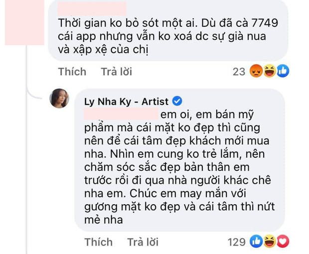 Trước lời nhận xét kém duyên này, "chị đẹp hột xoàn" đã lập tức lên tiếng đáp trả cực gắt: "Em ơi, em bán mỹ phẩm mà cái mặt không đẹp thì cũng nên để cái tâm đẹp khách mới mua nha. Nhìn em cũng không trẻ lắm nên chăm sóc sắc đẹp bản thân em trước rồi đi qua nhà người khác chê nha em. Chúc em may mắn với gương mặt không đẹp và cái tâm thì nứt mẻ nha". Màn đáp trả cao tay của Lý Nhã Kỳ khiến antifan im bặt không có bất cứ phản hồi nào thêm.