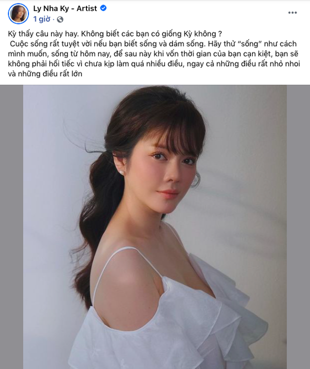 "Kỳ thấy câu này hay. Không biết các bạn có giống Kỳ không? Cuộc sống rất tuyệt vời nếu bạn biết sống và dám sống. Hãy thử 'sống' như cách mình muốn, sống từ hôm nay, để sau này khi vốn thời gian của bạn cạn kiệt, bạn sẽ không phải hối tiếc vì chưa kịp làm quá nhiều điều, ngay cả những điều rất nhỏ nhoi và những điều rất lớn", Lý Nhã Kỳ chiêm nghiệm.