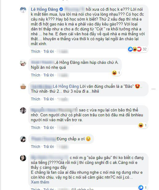 Khi antifan này cho rằng "thiếu căn bản rất nguy hiểm còn sự thật và thẳng thắn thì xã hội không chấp nhận", ý nói rằng mình nhận xét như vậy về vợ nam diễn viên là đúng sự thật nhưng không ai chịu chấp nhận, Hồng Đăng tiếp tục phản pháo: "Hồi xưa có đi học không em? Lời nói không mất tiền mua, lựa lời mà nói cho vừa lòng nhau. Có học được câu này không? Hay bỏ học sớm không biết? Thứ 2 xấu đẹp thì nhà em mất đi hột gạo nào không mà em phải vào đây kêu gào? Với loại dân trí thấp như em cho anh được dùng từ "Cút " ra khỏi tường nhà anh nhé. Em đem cái văn hoá đấy về quê nhà em mà thẳng với thật... Khuyên em thẳng vừa thôi không có ngày lại ngồi ăn cháo mất xinh".