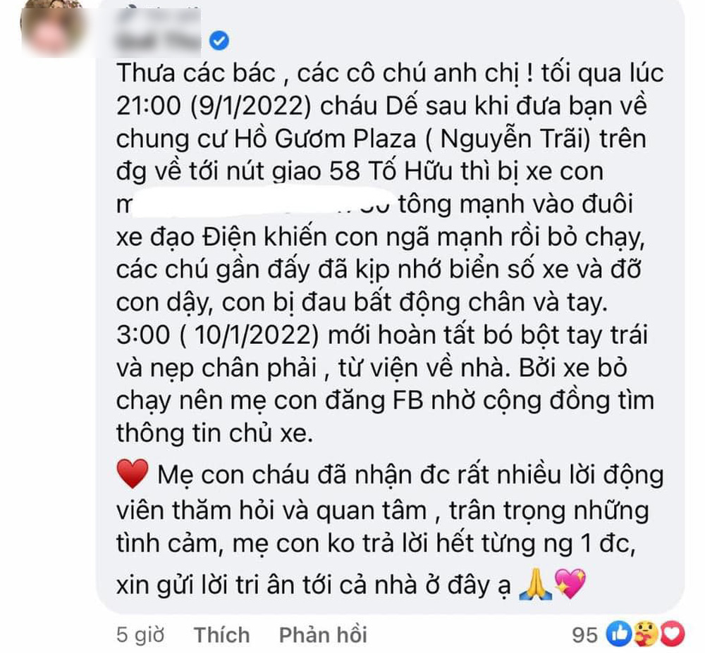 12/01/2022 02:52Đăng đàn 'truy tìm tài xế' đâm con trai mình gãy xương rồi bỏ chạy, nghệ sĩ Thu Quế lại bị 'tố ngược' phải xóa bài