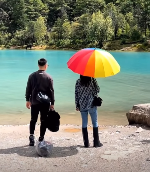 Trong chuyến du lịch, Hà Tiệp đeo kính râm, diện cả cây đen, tay xách nách mang hộ tống vợ. Trương Hinh Dư lộ rõ nét mặt hạnh phúc khi được chồng giúp "sống ảo". Hôn nhân viên mãn của nữ diễn viên khiến netizen không khỏi ngưỡng mộ.