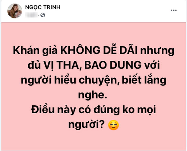 Vào ngày 4/11, một ngày sau khi giọng ca "Anh đang ở đâu đấy anh" đăng tâm thư xin lỗi người hâm mộ trên trang cá nhân, Ngọc Trinh đã bất ngờ chia sẻ status: "Khán giả không dễ dãi nhưng đủ vị tha và bao dung với người hiểu chuyện và biết lắng nghe. Điều này có đúng không mọi người?".