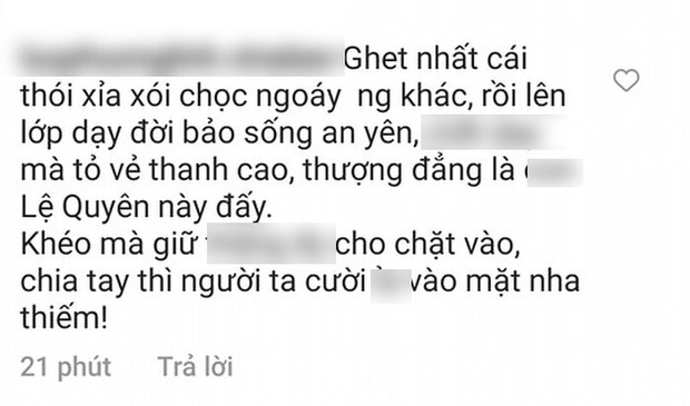 Mặc dù không đả động đến ai nhưng dưới phần bình luận, netizen bất ngờ ùa vào chỉ trích Lệ Quyên vì cô thường xuyên đăng đàn ẩn ý mỉa mai người khác. "Sao chị móc mỉa xỉa xói người khác vậy chị Quyên? Chị đẹp hơn ai, chị giàu hơn ai vậy? Thưa chị, người giàu người ta sợ nhất là người khác biết mình giàu và ngược lại, đạo lý mà sống *** ** là vứt nha chị", "Chị này chuyên đi nói xoáy người khác. Bản thân chị mới hay sân si nhưng lại chuyên đi nói người khác sân si. Ông trời công bằng lắm, chị cứ ác khẩu như vậy, cuộc đời sẽ sóng gió lắm đấy", "Ghét nhất cái thói xỉa xói chọc ngoáy người khác, rồi lên lớp dạy đời bảo sống an yên"... là những ý kiến gay gắt của cư dân mạng dưới bài đăng của Lệ Quyên.