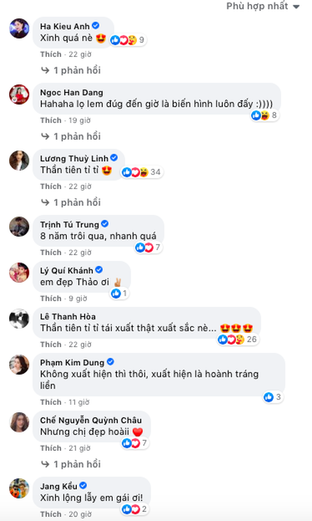 Không chỉ người hâm mộ, dưới phần bình luận, cả dàn sao Vbiz đình đám như Hoa hậu Hà Kiều Anh, Chế Nguyễn Quỳnh Châu, Hoa hậu Lương Thuỳ Linh,... đều lần lượt khen ngợi nhan sắc của Đặng Thu Thảo. Nói về vẻ đẹp của đàn chị, Lương Thuỳ Linh bày tỏ: "Thần tiên tỷ tỷ", Ngọc Hân trầm trồ: "Đúng lọ lem đến giờ là biến hình luôn đấy",...