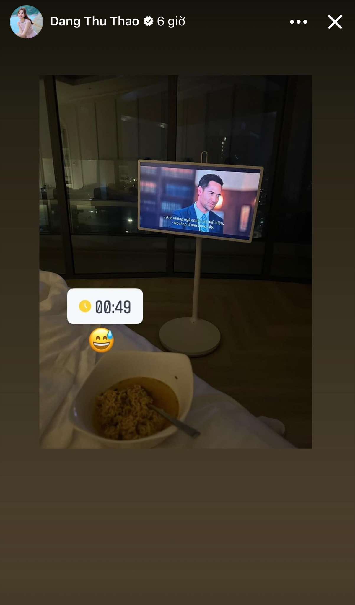 Mới đây, Hoa hậu Đặng Thu Thảo cập nhật story vào lúc gần 1 giờ sáng, cho biết cô đang vừa xem phim vừa ăn đêm bằng mì ăn liền. Kể từ khi sinh con lần 3, Hoa hậu Việt Nam 2012 không thường xuyên cập nhật mạng xã hội. Thời gian này, cô dành hết sự tập trung để chăm sóc em bé mới chào đời vài tháng. Có lẽ cũng vì bận rộn con mọn nên phải đến khi kết thúc ngày, nàng hậu mới có thời gian thư giãn cho bản thân.