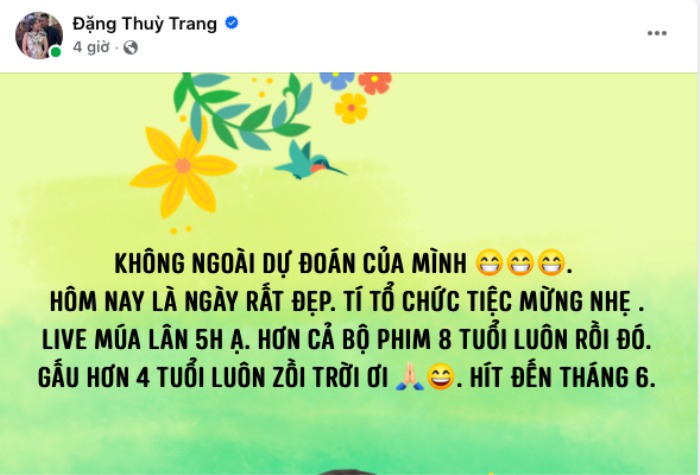 Mới đây nhất, bà Đặng Thùy Trang đã có bài đăng trên trang cá nhân khiến netizen xôn xao. Theo đó chị gái Đặng Thu Thảo viết: "Không ngoài dự đoán của mình. Hôm nay là ngày rất đẹp. Tí tổ chức tiệc mừng nhẹ. Live múa lân 5h ạ. Hơn cả bộ phim 8 tuổi luôn rồi đó. Gấu hơn 4 tuổi luôn rồi trời ơi. Hít đến tháng 6".