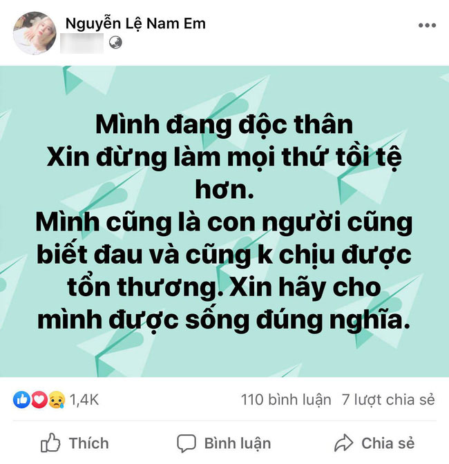 Cụ thể, trên trang cá nhân, người đẹp Tiền Giang đưa ra lời thỉnh cầu cư dân mạng hãy cho mình được sống đúng nghĩa: "Mình đang độc thân. Xin đừng làm mọi thứ tồi tệ hơn. Mình cũng là con người cũng biết đau và cũng không chịu được tổn thương. Xin hãy cho mình được sống đúng nghĩa".