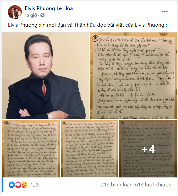 Giữa tâm bão xoay quanh chuyện tiền từ thiện 14 tỷ của NS Hoài Linh, danh ca Elvis Phương mới đây đã đăng tải những bức hình chụp bức tâm thư do chính anh viết tay để gửi tới khán giả.